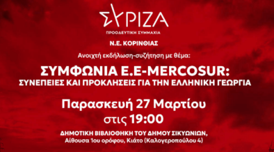 Η Νομαρχιακή Επιτροπή Κορινθίας του ΣΥΡΙΖΑ – Προοδευτική Συμμαχία σας προσκαλεί στην ανοιχτή εκδήλωση με θέμα “Συμφωνία Ευρωπαϊκής Ένωσης – Mercosur: Συνέπειες και προκλήσεις για την ελληνική γεωργία’’ που θα πραγματοποιηθεί στη Δημοτική Βιβλιοθήκη του Δήμου Σικυωνίων, στο Κιάτο, την Παρασκευή, 27 Μαρτίου στις 7μ.μ. Κεντρικοί ομιλητές της εκδήλωσης που φιλοδοξεί να αναδείξει τις προκλήσεις και τους κινδύνους […]