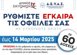 Ο Δήμος Σικυωνίων ενημερώνει τους δημότες ότι στις 14 Μαρτίου 2025 λήγει οριστικά η προθεσμία για τη ρύθμιση οφειλών προς τον Δήμο και τα νομικά του πρόσωπα. Μετά την ημερομηνία αυτή, όσοι δεν έχουν ρυθμίσει τα χρέη τους, σύμφωνα με τον νέο νόμο που ισχύει, κινδυνεύουν με κατασχέσεις τραπεζικών λογαριασμών, οι οποίες θα πραγματοποιούνται χωρίς προειδοποίηση και θα αφορούν ολόκληρο το ποσό της οφειλής.