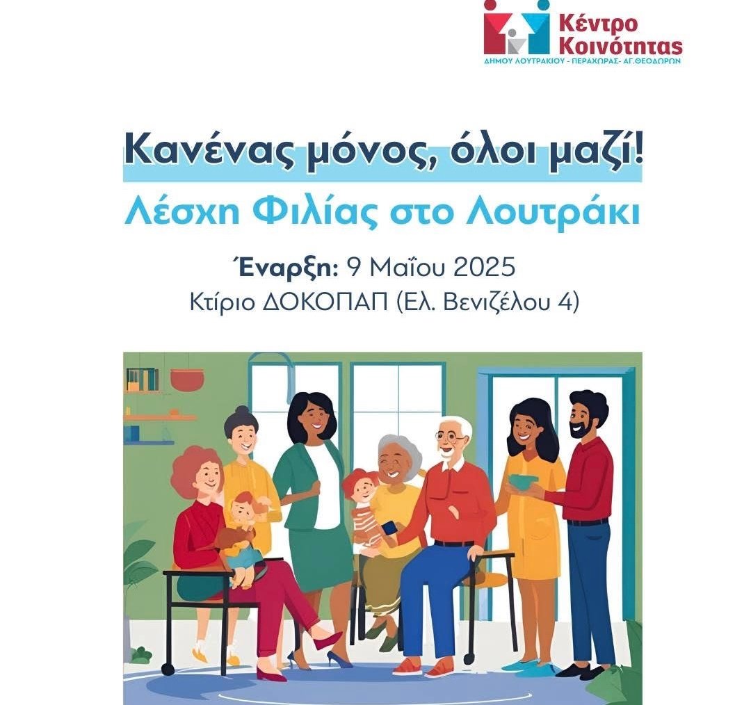 Με χαρά ανακοινώνουμε τη δημιουργία της Λέσχης Φιλίας στο Λουτράκι, στον 1ο όροφο του κτιρίου του ΔΟΚΟΠΑΠ (Ελ. Βενιζέλου 4). Ένας χώρος ανοιχτός σε όλους, για συντροφιά, συζήτηση, δημιουργική επαφή και κυρίως, ανθρώπινη ζεστασιά!