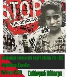 Στην  Κόρινθο  θα πραγματοποιηθεί συγκέντρωση διαμαρτυρίας για την σφαγή των αθώων στη Γάζα την Κυριακή 25 Μαΐου στις 12 ώρα στην πλατεία Παναγή Τσαλδάρη (Περιβολάκια).