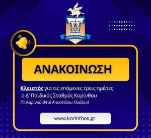 Ο Αντιδήμαρχος Κοινωνικής Πολιτικής Δήμου Κορινθίων, Χρήστος Μελέτης, ανακοινώνει ότι στις 9, 10 και 11/7/2025, ημέρες Τετάρτη, Πέμπτη και Παρασκευή αντίστοιχα, δεν θα λειτουργήσει ο Δ ́Παιδικός Σταθμός Κορίνθου (Πυλαρινού 84 & Αποστόλου Παύλου, Κόρινθος), για λόγους ασφαλείας, λόγω εσωτερικών οικοδομικών εργασιών εντός του Σταθμού.