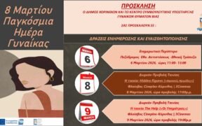 ΠΡΟΣΚΛΗΣΗ – «Η ΓΝΩΣΗ ΣΩΖΕΙ» Στο πλαίσιο των εκδηλώσεων για την Ημέρα της Γυναίκας, η Ένωση Αποστράτων Αξιωματικών Στρατού / Παράρτημα Κορίνθου , ο Δήμος Κορινθίων και το Επιμελητήριο Κορινθίας σας προσκαλούν σε ενημερωτική διάλεξη με θέμα: «Ο Καρκίνος του Μαστού: Πρόληψη – Διάγνωση – Θεραπεία» Η εκδήλωση θα πραγματοποιηθεί την Κυριακή 8 Μαρτίου 2026 και ώρα […]