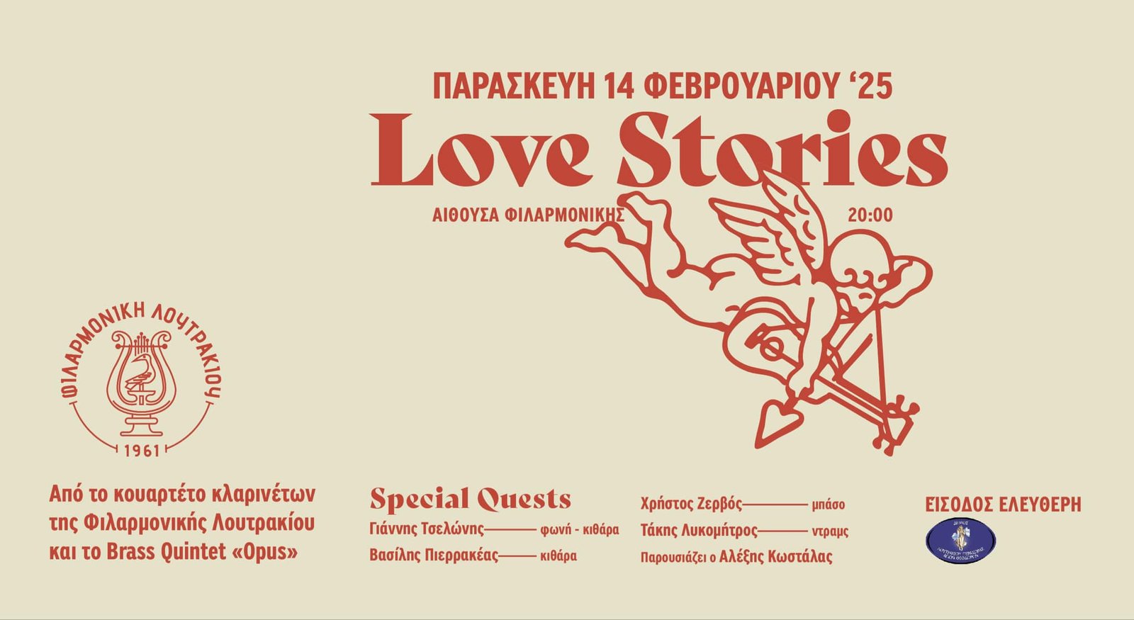 Την Παρασκευή 14 Φεβρουαρίου 2025 και ώρα 20.00 o Δήμος Λουτρακίου Περαχώρας Αγίων Θεοδώρων και τα μουσικά σύνολα της Φιλαρμονικής Λουτρακίου παρουσιάζουν τη συναυλία “Love Stories”!