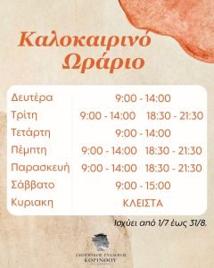Σας ενημερώνουμε ότι από 1/07/2025 τίθεται σε ισχύ το προαιρετικό καλοκαιρινό ωράριο λειτουργίας των καταστημάτων.