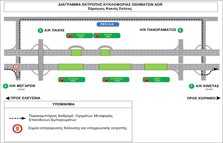 Στο διάστημα αυτό τα συγκεκριμένα οχήματα θα εξυπηρετούνται μέσω της Παλαιάς Εθνικής Οδού μεταξύ των κόμβων Μεγάρων και Κινέτας, όπως φαίνεται στο ακόλουθο σχηματικό διάγραμμα: