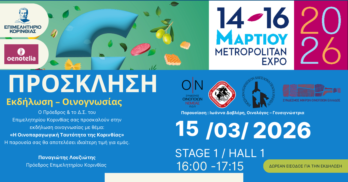 Συμμετοχή του Επιμελητηρίου Κορινθίας στην έκθεση FOOD EXPO & OENOTELIA 2026 – Πρόσκληση σε εκδήλωση Οινογνωσίας