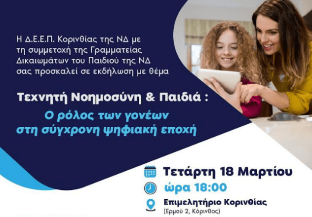 Η Διοικούσα Επιτροπή Εκλογικής Περιφέρειας Κορινθίας της ΝΔ, με τη συμμετοχή της Γραμματείας Δικαιωμάτων του Παιδιού, διοργανώνει ενημερωτική εκδήλωση με θέμα: