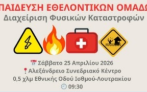 Ο Σύλλογος Εθελοντών Πυροπροστασίας Δασών Λουτρακίου – Περαχώρας, σε συνεργασία με την OlamAid, την ΚΕΑΝ και τον Δήμο Λουτρακίου – Περαχώρας – Αγίων Θεοδώρων, διοργανώνει και προσκαλεί όλες τις εθελοντικές ομάδες της Κορινθίας και κάθε ενεργό πολίτη σε μια ολοκληρωμένη εκπαιδευτική δράση. Στόχος μας είναι η ενίσχυση των δεξιοτήτων για μια άμεση, ασφαλή και αποτελεσματική αντιμετώπιση έκτακτων αναγκών. Πότε και […]