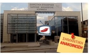 Σας ενημερώνουμε ότι, λόγω της αυξημένης κατανάλωσης νερού αλλά και της μείωσης της παροχής των πηγών της Στυμφαλίας, από αύριο Παρασκευή 11-7-2025, η υδροδότηση των οικισμών Ρειτού και Γαλατακίου θα γίνεται αποκλειστικά με νερό των τοπικών γεωτρήσεων. Το νερό στους ανωτέρω οικισμούς θα θεωρείται ΜΗ ΠΟΣΙΜΟ, κατάλληλο ωστόσο για οποιαδήποτε άλλη οικιακή χρήση, έως ότου γίνουν […]