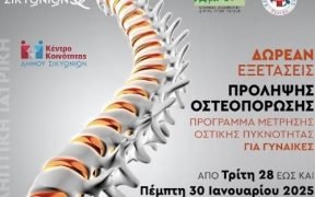 Ο Δήμος Σικυωνίων, σε συνεργασία με το Ελληνικό Διαδημοτικό Δίκτυο Υγιών Πόλεων (ΕΔΔΥΠΠΥ), το ΚΕΠ Υγείας και το Κέντρο Κοινότητας του Δήμου, διοργανώνει Πρόγραμμα Μέτρησης Οστικής Πυκνότητας για γυναίκες, με στόχο την πρόληψη της οστεοπόρωσης. Το πρόγραμμα θα πραγματοποιηθεί από την Τρίτη 28 έως και την Πέμπτη 30 Ιανουαρίου 2025, κατά τις πρωινές ώρες, στο […]