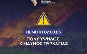 🗓 Πέμπτη 07 Αυγούστου 2025 ‼️ Πολύ υψηλός κίνδυνος πυρκαγιάς (κατηγορία κινδύνου 4️⃣ ) ⚠️ Ολόκληρη η Π.Ε. Κορινθίας και ο Δήμος Λουτρακίου – Περαχώρας – Αγίων Θεοδώρων τίθενται σε κατάσταση αυξημένης ετοιμότητας Πολιτικής Προστασίας. 🗺️📌 Σύμφωνα με τον Χάρτη Πρόβλεψης Κινδύνου Πυρκαγιάς που εκδίδει η Γενική Γραμματεία Πολιτικής Προστασίας του Υπουργείου Κλιματικής Κρίσης και […]