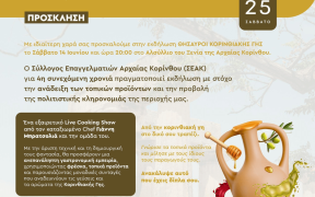 Ο Σύλλογος Επαγγελματιών Αρχαίας Κορίνθου (ΣΕΑΚ), με ιδιαίτερη χαρά, σας προσκαλεί στην εκδήλωση «ΘΗΣΑΥΡΟΙ ΚΟΡΙΝΘΙΑΚΗΣ ΓΗΣ», η οποία θα πραγματοποιηθεί για 4η συνεχόμενη χρονιά το Σάββατο 14 Ιουνίου 2025 και ώρα 20:00, στο Αλωνάκι του Ξενία στην Αρχαία Κόρινθο. Η εκδήλωση τελεί υπό την αιγίδα του Επιμελητηρίου Κορινθίας και έχει στόχο την ανάδειξη των τοπικών προϊόντων και την προβολή της πολιτιστικής κληρονομιάς της περιοχής μας, […]
