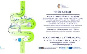 Ο Δήμος Λουτρακίου – Περαχώρας – Αγίων Θεοδώρων σας προσκαλεί στην εκδήλωση παρουσίασης των Εναλλακτικών Σεναρίων Χωρικής Ανάπτυξης για το Ειδικό Πολεοδομικό Σχέδιο (Ε.Π.Σ.) των Δημοτικών Ενοτήτων: • Λουτρακίου – Περαχώρας • Αγίων Θεοδώρων Η εκδήλωση θα πραγματοποιηθεί την Παρασκευή 16 Ιανουαρίου 2026 και ώρα 18:00, στην Αίθουσα Δημοτικού Συμβουλίου του Δημαρχείου Λουτρακίου. Τι […]