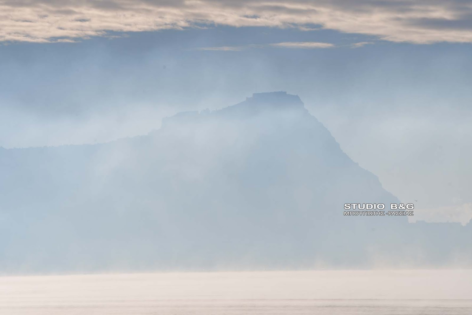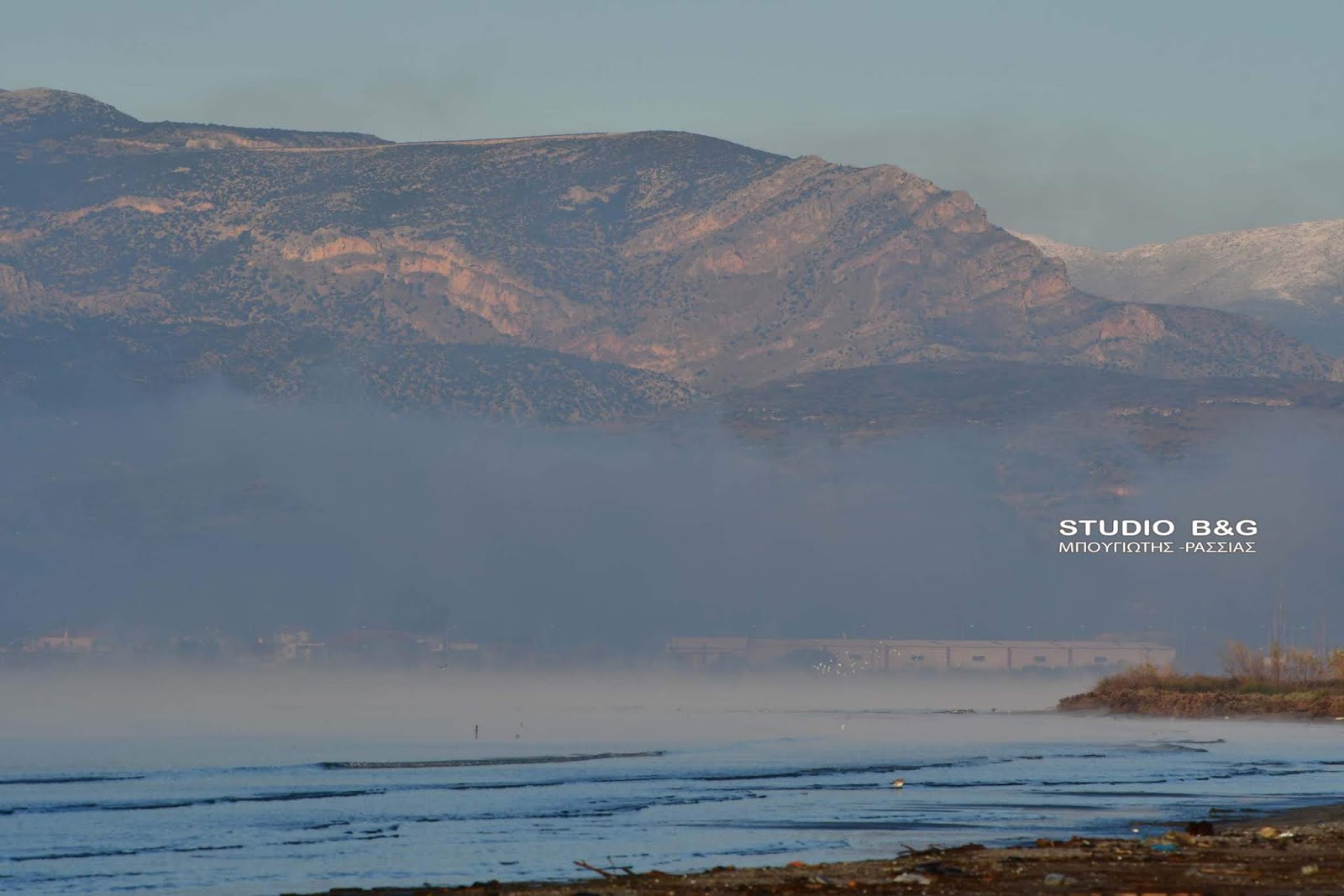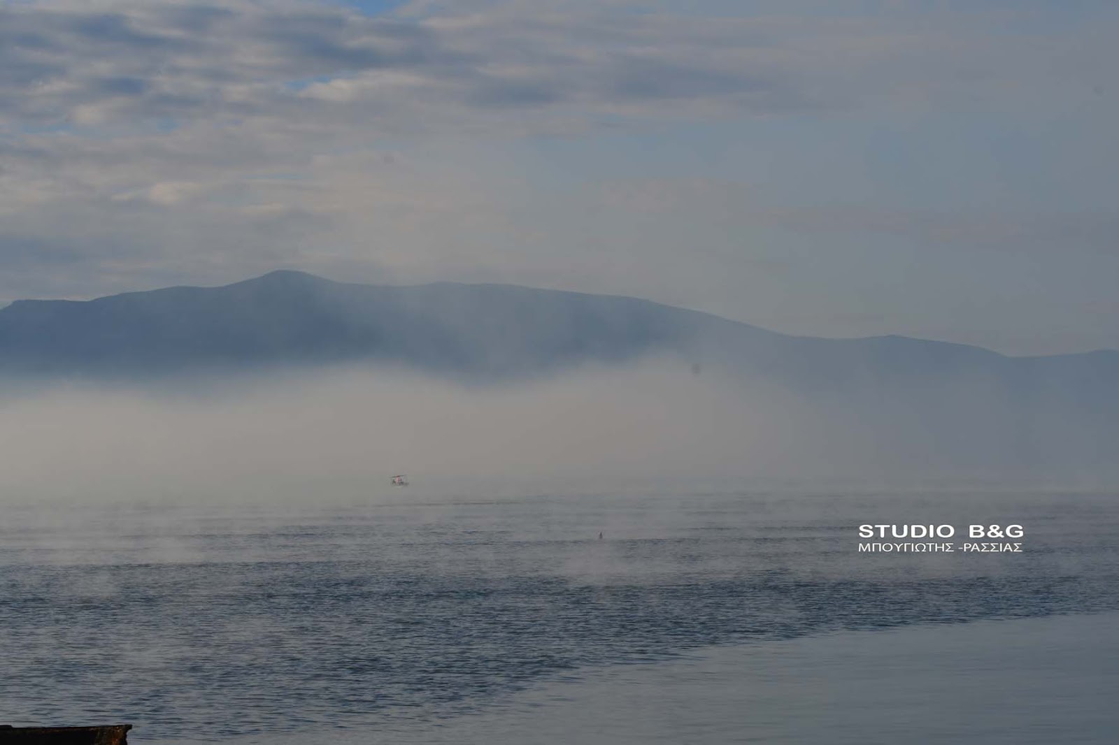 Η εικόνα που δημιουργήθηκε στον Αργολικό κόλπο νωρίς το πρωί της Τετάρτης με τα χιονισμένα γύρω βουνά ήταν εντυπωσιακή καθώς η θάλασσα άχνιζε, δημιουργώντας την εντύπωση πως “βράζει”.