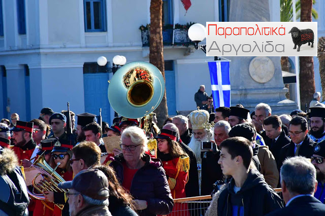 Προηγήθηκε θεία λειτουργία έγινε και ο μεγάλος αγιασμός στον Μητροπολιτικό Ναό του Άγιου Γεωργίου χοροστατούντος του Μητροπολίτη Αργολίδος Νεκταρίου παρόντων των στρατιωτικών και πολιτικών αρχών του τόπου.