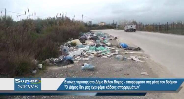 Εικόνες ντροπής στον Δήμο Βέλου-Βόχας με τους κατοίκους να δηλώνουν αγανακτισμένοι ότι αναγκάζονται να πετάνε στην μέση του δρόμου τα σκουπίδια τους, καθώς ο Δήμος δεν έχει τοποθετήσει κάδους απορριμμάτων.