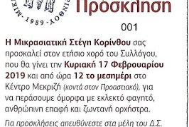 Η Μικρασιατική Στέγη Κορίνθου σας προσκαλεί στον ετήσιο χορό της ,που θα πραγματοποιηθεί την Κυριακή 17 Φεβρουαρίου 2019 και ώρα 12,00 , στην αίθουσα εκδηλώσεων ΜΕΚΡΙΖΗΣ . Θα είναι χαρά μας να σας έχουμε κοντά μας, να ανταμώσουμε, να γευτούμε το εκλεκτό φαγητό και το καλό κρασί, να χορέψουμε και να τραγουδήσουμε Μικρασιάτικα και όχι […]