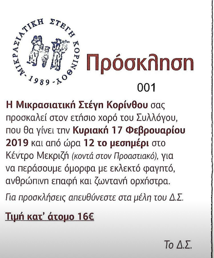 Η Μικρασιατική Στέγη Κορίνθου σας προσκαλεί στον ετήσιο χορό της ,που θα πραγματοποιηθεί την Κυριακή 17 Φεβρουαρίου 2019 και ώρα 12,00 , στην αίθουσα εκδηλώσεων ΜΕΚΡΙΖΗΣ .