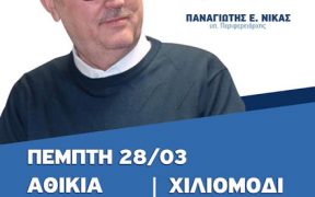 Την Πέμπτη 28 Μαρτίου και ώρα 19:00, ο Δήμαρχος Καλαμάτας και υπ. Περιφερειάρχης Πελοποννήσου Παναγιώτης Νίκας θα βρίσκεται στα Αθίκια Κορινθίας (καφενείο «Κόλλιας») και στη συνέχεια, στις 20:15, στο Χιλιομόδι Κορινθίας (ταβέρνα «Ρόκος»). Ο κος Νίκας θα πραγματοποιήσει ανοικτές συναντήσεις με τους κατοίκους των εν λόγω περιοχών και θα συζητήσει μαζί τους για θέματα που […]