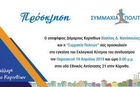 Η «Συμμαχία πολιτών» του Β.Νανόπουλου αύριο στις 20.00 εγκαινιάζει το εκλογικό κέντρο του συνδυασμού,και σας περιμένει στην οδό Εθνικής Αντίστασης 21 στο κέντρο της Κορίνθου.