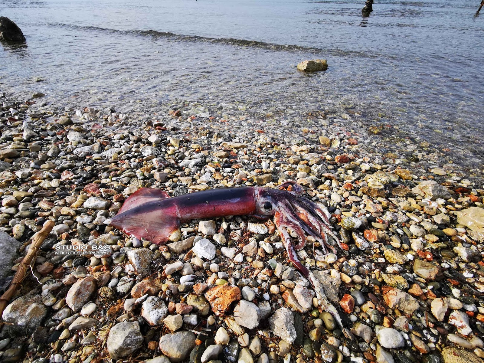 Ένα ακόμα τεράστιο καλαμάρι εντοπίσθηκε στην παραλία Καραθώνας στο Ναύπλιο την Τρίτη 11 Φεβρουαρίου 2020.