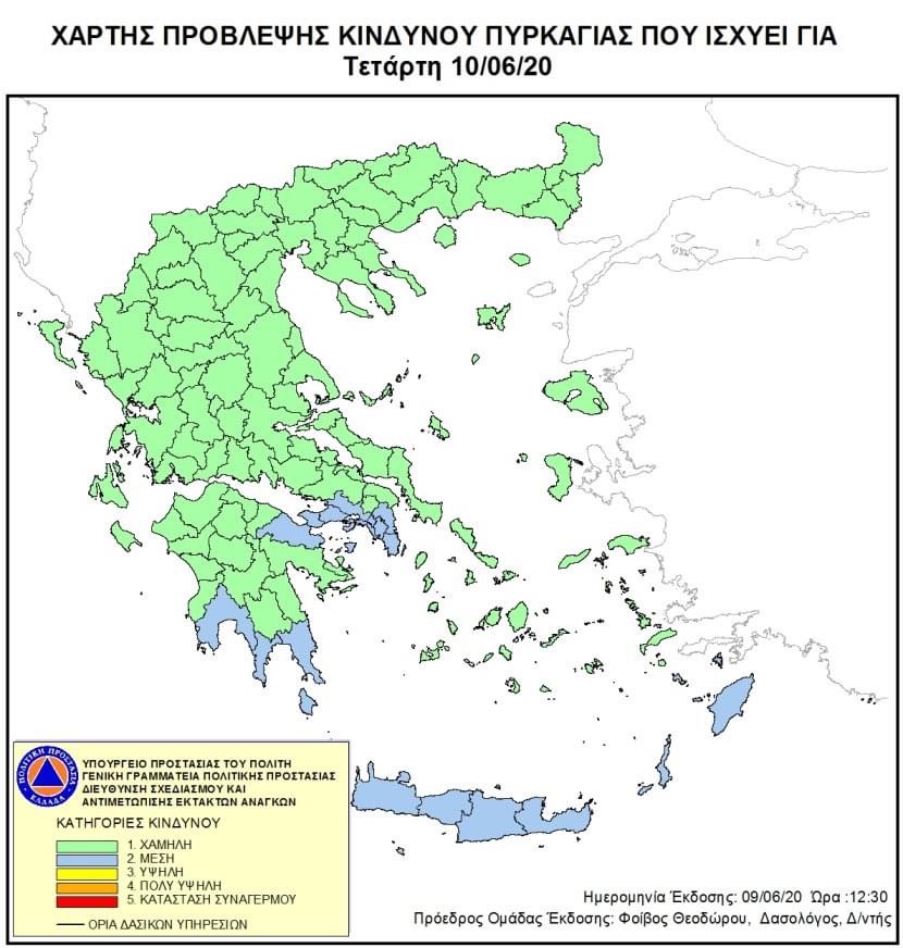 Σύμφωνα με το Χάρτη Πρόβλεψης Κινδύνου Πυρκαγιάς  που εκδίδει η Γενική Γραμματεία Πολιτικής Προστασίας για αύριο Τετάρτη 10 Ιουνίου 2020, προβλέπεται μέσος κίνδυνος πυρκαγιάς (κατηγορία κινδύνου 2) σε περιοχές της Αττικής, Κορινθίας, Λακωνίας, Μεσσηνίας, Κυθήρων, Δωδεκανήσων & Κρήτης