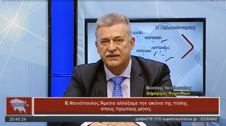 Αποκαλυπτική συνέντευξη παραχώρησε ο Δήμαρχος Κορινθίων Βασίλης Νανόπουλος στην τηλεόραση του super.Μεσα σε μια ώρα ανέλυσε και μας ενημέρωσε για ολα τα ζητήματα του Δήμου.Εργα που υλοποιούνται αλλά και σχέδια που θα αλλάξουν τον Δημο σε όλους τους τομείς.