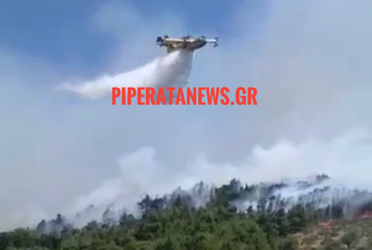 Η φωτιά και απειλεί τον οικισμό Λεύκα. Στο σημείο εθελοντές άντρες της πυροσβεστικής υπηρεσίας καθώς και εναέριες δυνάμεις. Αποπνυκτική η ατμόσφαιρα στο σημείο.