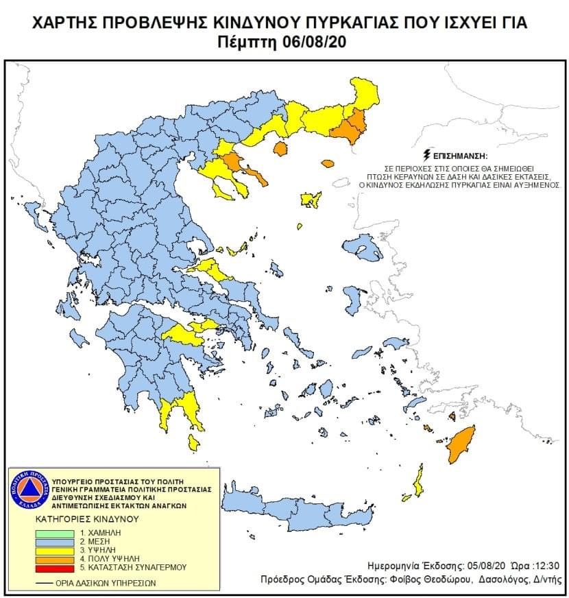 ⚠️ Σύμφωνα με το Χάρτη Πρόβλεψης Κινδύνου Πυρκαγιάς Φωτιά που εκδίδει η Γενική Γραμματεία Πολιτικής Προστασίας για αύριο, Πέμπτη 06.08.2020, προβλέπεται πολύ υψηλός κίνδυνος πυρκαγιάς (κατηγορία κινδύνου 4) σε Χαλκιδική, Θάσο, Έβρο, Σαμοθράκη, Ρόδο και Μεγίστη.Δειτε το σχετικό χάρτη: