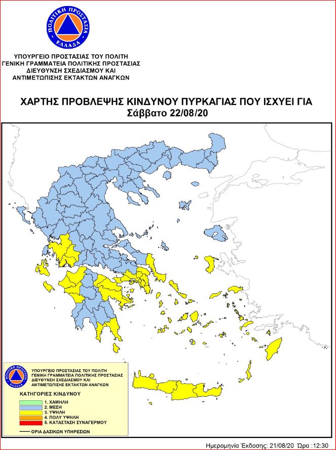 Στην κατηγορία κινδύνου 3 (υψηλή) θα βρίσκεται η Αργολίδα το Σάββατο 22 Αυγούστου 2020, σύμφωνα με την πρόβλεψη της Γενικής Γραμματείας Πολιτικής Προστασίας όπως αποτυπώνεται στον επισυναπτόμενο ημερήσιο Χάρτη Πρόβλεψης Κινδύνου Πυρκαγιάς.