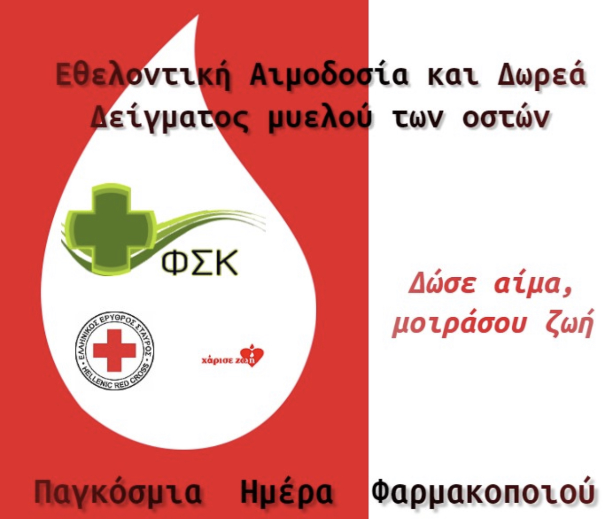 Ο Φαρμακευτικος Συλλογος Κορινθιας σε συνεργασία με τον Ελληνικός Ερυθρός Σταυρός Κορίνθου και το Γενικό Νοσοκομείο Κορίνθου, στηρίζοντας έμπρακτα έναν από τους σημαντικότερους πυλώνες του κοινωνικού εθελοντισμού συμβάλλοντας παράλληλα στην εθνική προσπάθεια για εξασφάλιση επάρκειας αίματος , διοργανώνει εθελοντική αιμοδοσία και ταυτόχρονη δράση ενημέρωσης και λήψη δείγματος για δότες μυελού των οστών σε συνεργασία με το «Χάρισε Ζωή»,