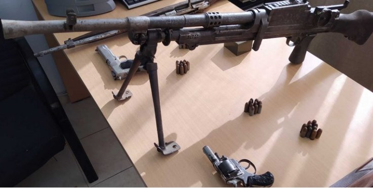 Σύμφωνα με την Αστυνομία, άνδρες της Ασφάλειας, αξιοποιώντας πληροφορίες που είχαν συγκεντρώσει, έκαναν έρευνα σε αποθήκη του συλληφθέντα, όπου βρήκαν ένα οπλοπολυβόλο στρατιωτικού τύπου- διαμετρήματος 7,62 χιλιοστών, ένα πολεμικό τυφέκιο, ένα περίστροφο, ένα πιστόλι 0,4 χιλιοστών, ένα κυνηγετικό όπλο και 50 φυσίγγια των 0,45 χιλιοστών. Τα όπλα και τα φυσίγγια που βρέθηκαν, θα αποσταλούν στο τμήμα εργαστηρίων πυροβόλων όπλων και ιχνών εργαλείων της διεύθυνσης Εγκληματολογικών Ερευνών για εργαστηριακές εξετάσεις.