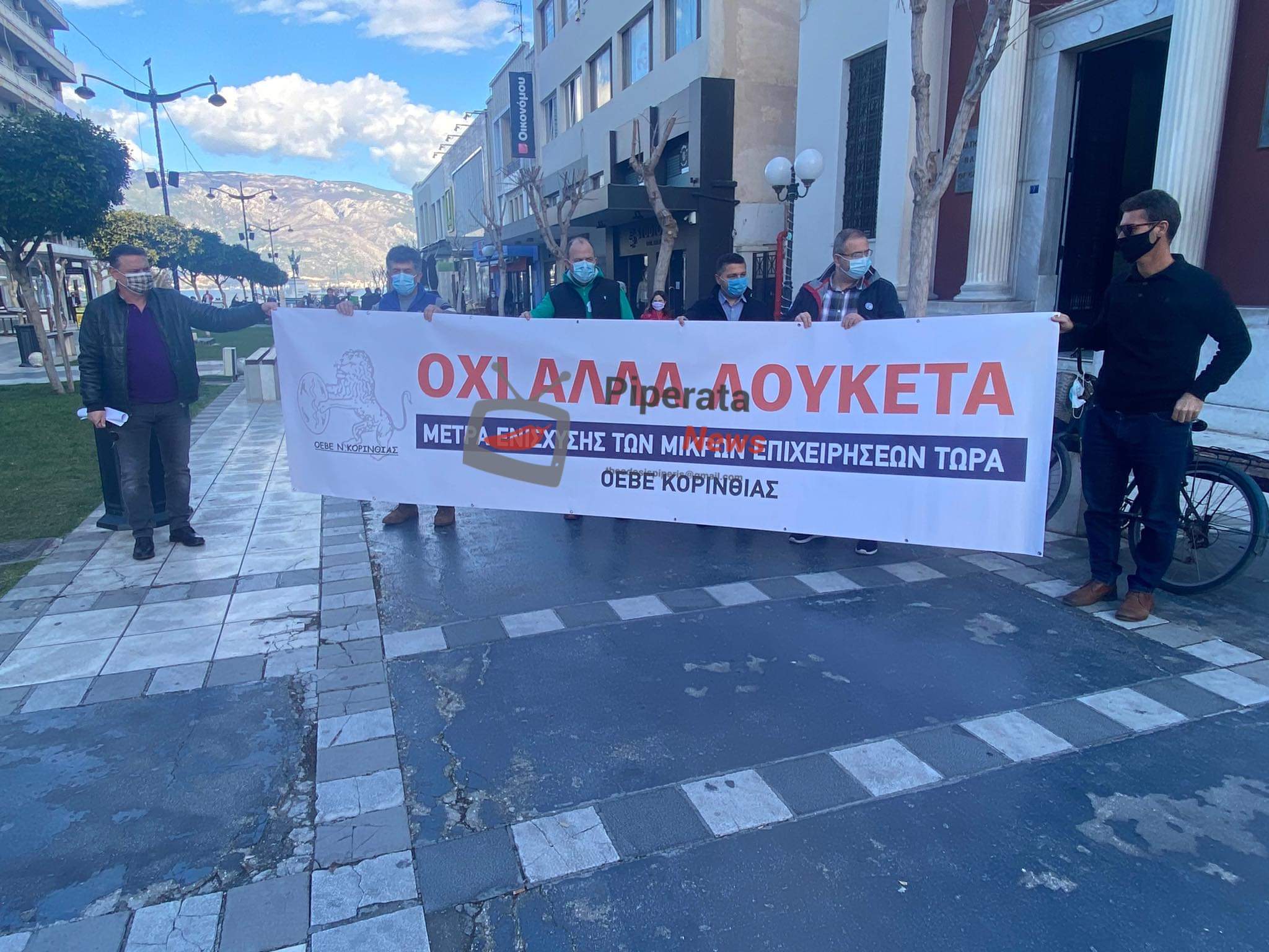 Σαν ΟΕΒΕ Κορινθίας σήμερα, Τρίτη 5/1/2021, εκφράσαμε δημόσια τη διαμαρτυρία μας για τα μέτρα της κυβέρνησης που στην πραγματικότητα οδηγούν τις επιχειρήσεις μας στο λουκέτο. Στη διαμαρτυρία συμμετείχαν ο πρόεδρος της ΟΕΒΕ Κορινθίας, κ. Τάσος Μποζίκης, ο ΓΓ της ΟΕΒΕ Κορινθίας, κ. Θοδωρής Βασιλακόπουλος, ο αντιπρόεδρος της ΟΕΒΕ Κορινθίας, κ. Μιχάλης Μεζίνης, οι πρόεδροι των Εμπορικών Συλλόγων Κορίνθου, κ. Βασίλης Γεώργαρης και Αγίων Θεοδώρων, κ. Νικόλαος Θεοδοσάκης, ο πρόεδρος του Σωματείου Ταξί κ. Ιωάννης Πιπίνης και ο πρόεδρος του Σωματείου Μεσιτών, κ. Σιδερης Πλιτσικίδης.