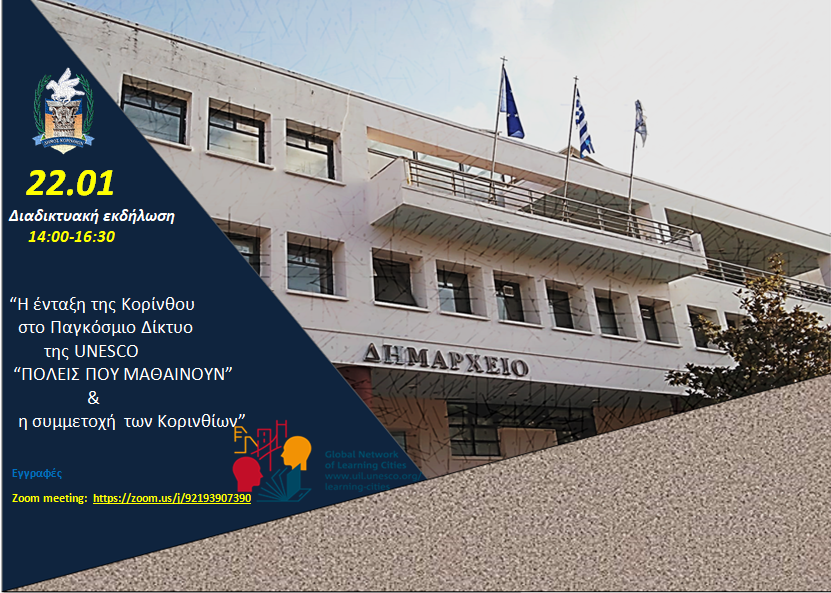 Ο Δήμαρχος Κορινθίων κ. Βασίλης Νανόπουλος και η Ομάδα της Κορίνθου για το Παγκόσμιο Δίκτυο της UNESCO των Πόλεων που Μαθαίνουν σας προσκαλούν να συμμετάσχετε στη διαδικτυακή εκδήλωση: “Η ένταξη της Κορίνθου στο Παγκόσμιο Δίκτυο της UNESCO των Πόλεων που Μαθαίνουν και η συμμετοχή των Κορινθίων”  που θα πραγματοποιηθεί τηνΠαρασκευή, 22 Ιανουαρίου 2021 και ώρες 14:00-16:30.