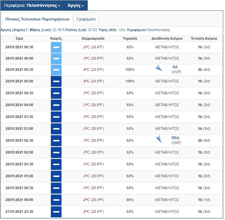 Ενδεικτικός είναι ο πίνακας των θερμοκρασιών που επικράτησαν στην Αργολίδα όλη τη νύχτα με τον υδράργυρο να πέφτει μέχρι και τους -4 βαθμούς Κελσίου σύμφωνα με τον αυτόματο μετεωρολογικό σταθμό της ΕΜΥ στο Άργος