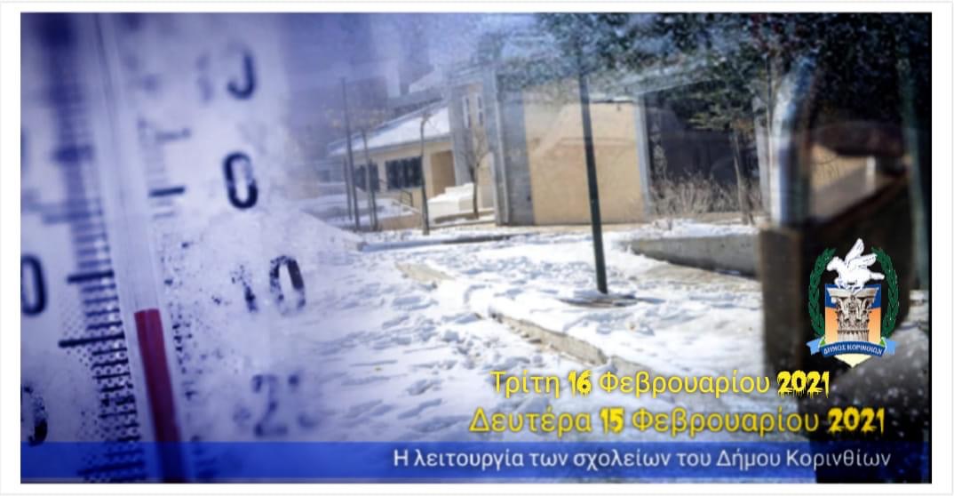 Κλειστές θα παραμείνουν οι σχολικές μονάδες όλων των βαθμίδων του Δήμου Κορινθίων (νηπιαγωγεία, δημοτικά, γυμνάσια, λύκεια και παιδικοί σταθμοί) λόγω των έκτακτων καιρικών φαινομένων που επικρατούν και στην περιοχή μας, των χαμηλών θερμοκρασιών που καταγράφονται και των υγειονομικών πρωτοκόλλων αντιμετώπισης της πανδημίας, την Δευτέρα 15 Φεβρουαρίου και την Τρίτη 16 Φεβρουαρίου.