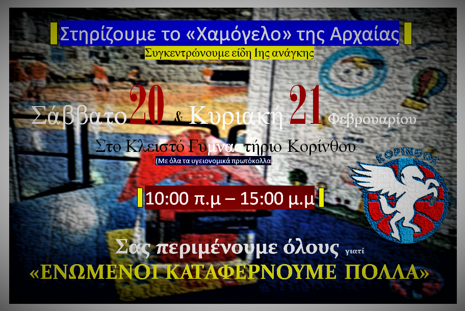 Πολίτες, επιχειρήσεις, φορείς λοιπόν, το Σαββατοκύριακο 20 και 21 Φεβρουαρίου συγκεντρώνουμε είδη πρώτης ανάγκης στο κλειστό Γυμναστήριο Κορίνθου.