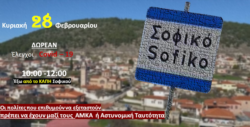 ΔΩΡΕΑΝ εξέταση για Covid-19 στο Σοφικό την Κυριακή 28/2/21