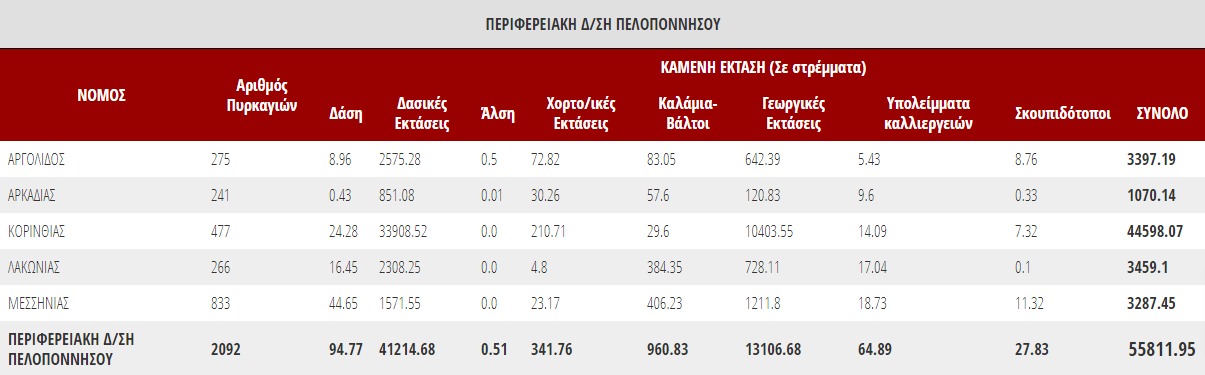 Πελοπόννησος 477 το 2020 στην Κορινθία -Αναλυτικά Στοιχεία για όλη την Περ. Πελοποννήσου theodosis 6 Μαρτίου 2021 Share Στην Πελοπόννησο το 2020 κάηκαν συνολικά 55.811.95 στρέμματα αγροτοδασικών εκτάσεων και συγκεκριμένα ανά περιφερειακή ενότητα :