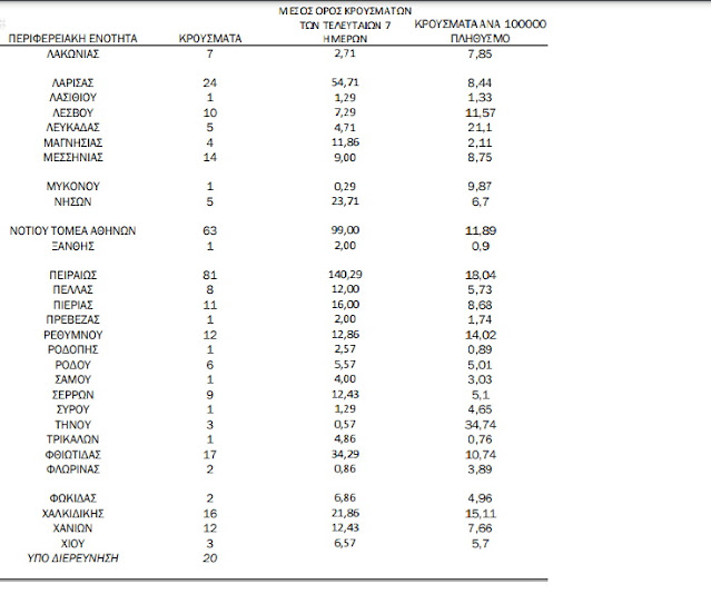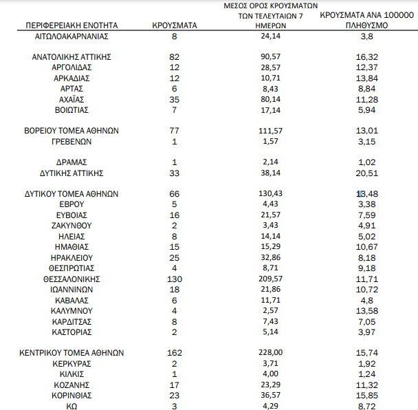 Δείτε στους παρακάτω πίνακες, αναλυτικά, σε ποιες περιοχές καταγράφηκαν τα νέα κρούσματα κορωνοιού, την Κυριακή (7/3/21):