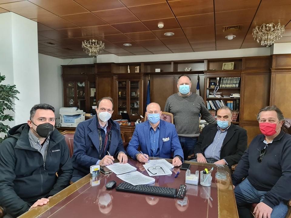 🟢 Υπεγράφη σήμερα το πρωί η σύμβαση για το έργο «Ανακατασκευή γηπέδου ποδοσφαίρου στην Περαχώρα» μεταξύ του Δημάρχου Λουτρακίου – Περαχώρας – Αγίων Θεοδώρων Γεωργίου Αλκ. Γκιώνη και του νόμιμου εκπροσώπου της αναδόχου εταιρείας «Κ/Ξ 7 ΓΕΝΝΑΤΟΣ ΘΕΟΦΑΝΗΣ – ΓΕΝΑΤΟΣ ΘΕΟΦΑΝΗΣ & ΣΙΑ Ε.Ε.», παρουσία του Αντιδημάρχου Α.Α. Διοικητικού/ Οικονομικού Αναστάσιου Σακελλαρίου, του Αντιδημάρχου Πολιτισμού – Αθλητισμού Αθανάσιου Παπαθανασίου, του Προέδρου Δημοτικού Συμβουλίου Φίλιππα Θυμή και του πρώην δημοτικού συμβούλου Ευάγγελου Βλάση.