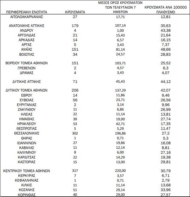 Σήμερα, Παρασκευή 19 Μαρτίου, από τα 2.785 κρούσματα που καταμετρήθηκαν στη χώρα σε 24 ώρες, τα 1.281 βρέθηκαν στην Αττική, τα 302 στη Θεσσαλονίκη, 151 στην Αχαΐα και 40 στην Κορινθία.