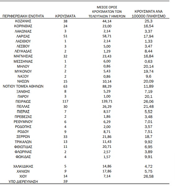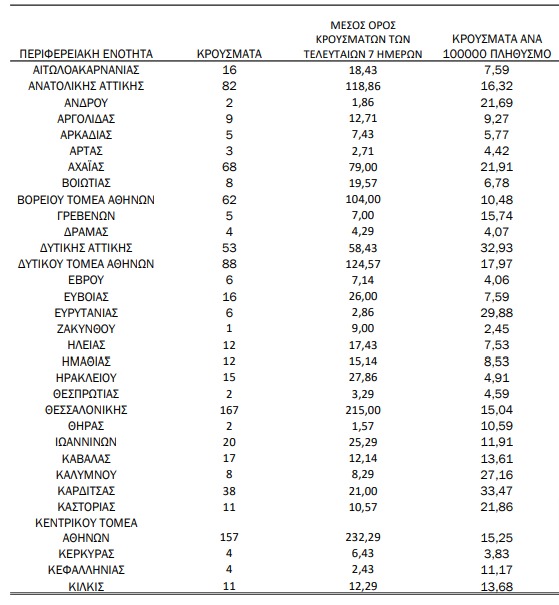 Από το σύνολο των 1.496 νέων κρουσμάτων του νέου ιού στη χώρα 7 είναι εισαγόμενα εκ των οποίων 5 εντοπίστηκαν κατόπιν ελέγχων στις πύλες εισόδου της χώρας. Η κατανομή των 1.489 νέων εγχώριων κρουσμάτων ανά Περιφερειακή Ενότητα παρουσιάζεται στον κατωτέρω πίνακα: