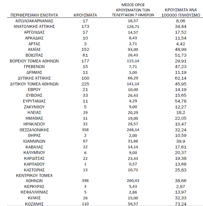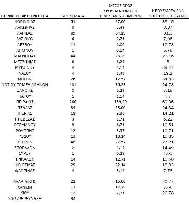 Ακολουθούν με διψήφιο αριθμό κρουσμάτων οι: Αιτωλοακαρνανία 17, Αργολίδα 17, Αρκαδία 10, Βοιωτία 61, Γρεβενά 15, Δράμα 11, Έβρος 21, Εύβοια 33, Ευρυτανία 11, Ηλεία 29, Ημαθία 31, Ηράκλειο 32, Ιωάννινα 67, Καβάλα 22, Καρδίτσα 22, Καστοριά 13, Κιλκίς 26, Κορινθία 51, Λάρισα 89, Λέσβος 11, Μαγνησία 44, Πέλλα 34, Πιερία 18, Ροδόπη 12, Ρόδος 13, Σέρρες 48, Τρίκαλα 14, Φθιώτιδα 29, Χαλκιδική 22, Χανιά 12, Χίος 12.