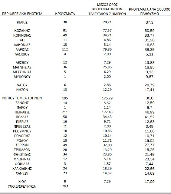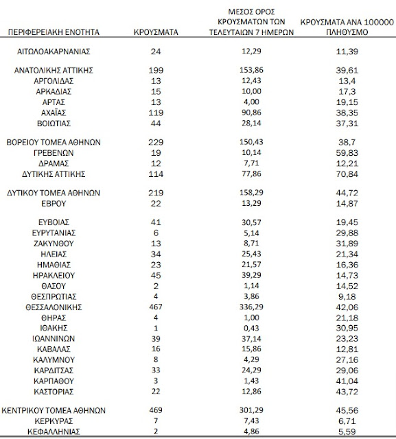 Η κατανομή των 3.480 νέων εγχώριων κρουσμάτων ανά Περιφερειακή Ενότητα παρουσιάζεται στον κατωτέρω πίνακα