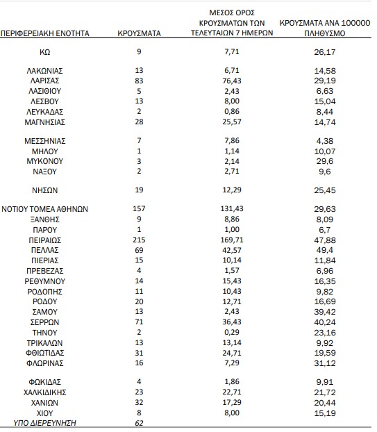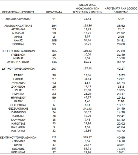 Από το σύνολο των 3.232 νέων κρουσμάτων του νέου ιού στη χώρα 5 είναι εισαγόμενα εκ των οποίων 4 εντοπίστηκαν κατόπιν ελέγχων στις πύλες εισόδου της χώρας. Η κατανομή των 3.227 νέων εγχώριων κρουσμάτων ανά Περιφερειακή Ενότητα παρουσιάζεται στον κατωτέρω πίνακα