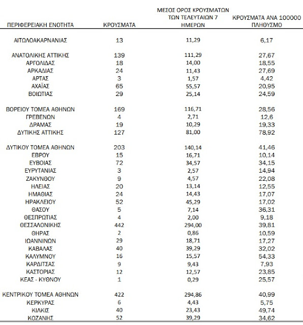 Η κατανομή των 2.999 νέων εγχώριων κρουσμάτων ανά Περιφερειακή Ενότητα παρουσιάζεται στον κατωτέρω πίνακα