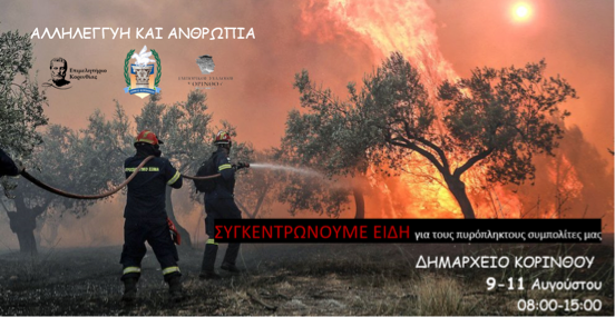 Ο Δήμος Κορινθίων, σε συνεργασία με το Επιμελητήριο Κορινθίας και τον Εμπορικό Σύλλογο Κορίνθου συγκεντρώνουν από σήμερα Δευτέρα 9 Αυγούστου έως και την Τετάρτη 11 Αυγούστου, είδη πρώτης ανάγκης για τους πυρόπληκτους συμπολίτες μας στο ισόγειο του Δημαρχείου (Κολιάτσου 32)