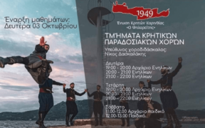 Έναρξη χορευτικών και μουσικών τμημάτων Η Ένωση Κρητών Κορινθίας “ο Ψηλορείτης” εύχεται στα μέλη και στους φίλους της καλή καινούρια πολιτιστική χρονιά και με χαρά ανακοινώνει την λειτουργία των τμημάτων: Τμήματα κρητικών παραδοσιακών χορών Δευτέρα 19.00-20.00 (αρχάριοι ενήλικες) 20.00-21.00 21.00-22.00 Τετάρτη 19.00-20.00 (αρχάριοι ενήλικες) 20.00-21.00 21.00-22.00 Σάββατο 11.00-12.00 (αρχάριοι παιδικό) 12.00-13.00 (παιδικό) Υπεύθυνος χοροδιδάσκαλος: κ. […]