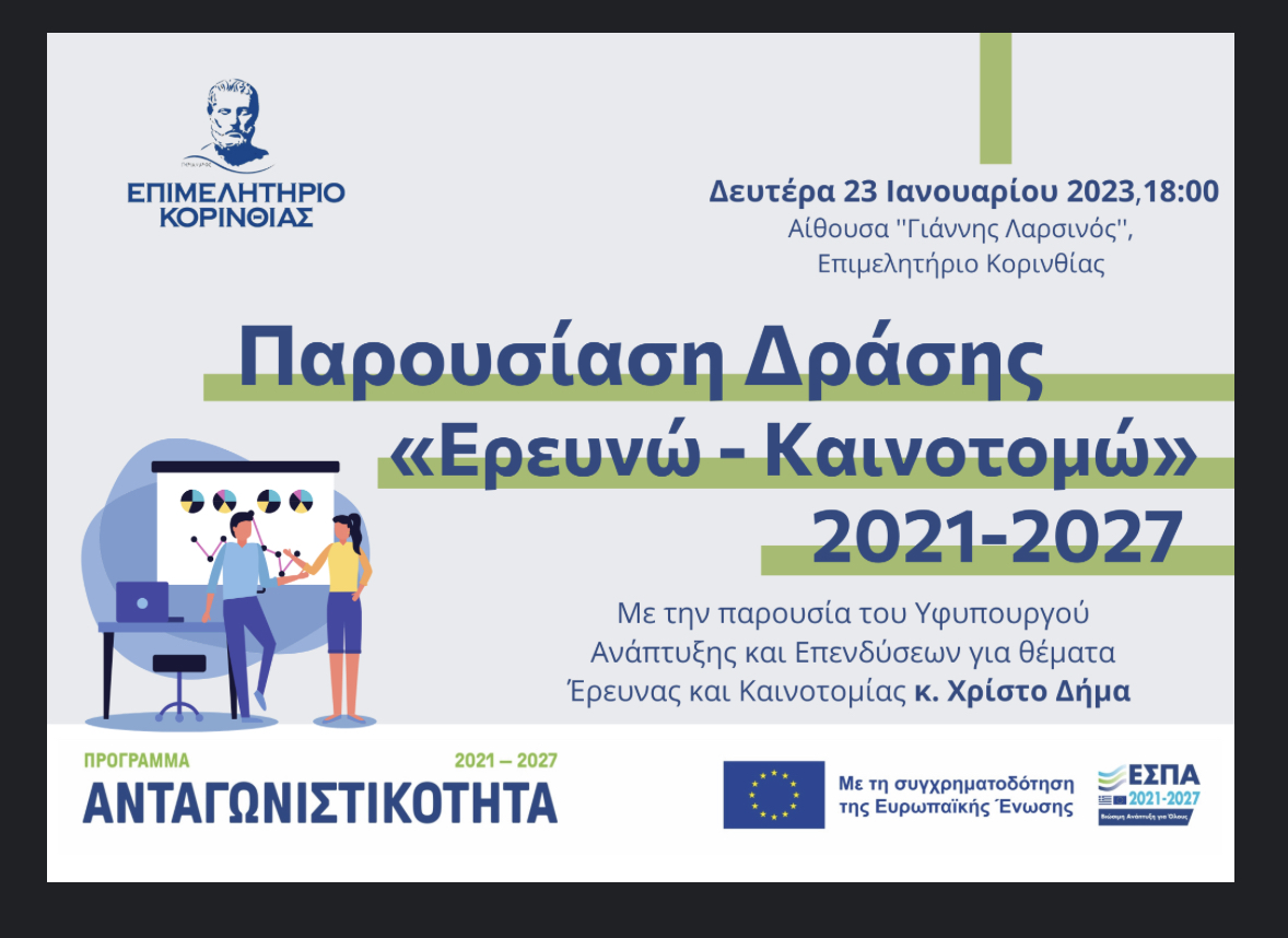 Πρόσκληση σε παρουσίαση της Δράσης ”Ερευνώ- Καινοτομώ 2021-2027”